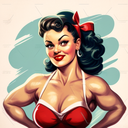 happy pin up muscle mummy, beautiful face, flexing her bicep, realistic, white background --v 4 --s 750