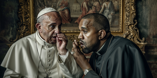 Realistic photograph of Kanye West angrily whispering something into the Pope's Ear, the Pope has a surprised and frightened look on his face --ar 2:1 --v 6.0