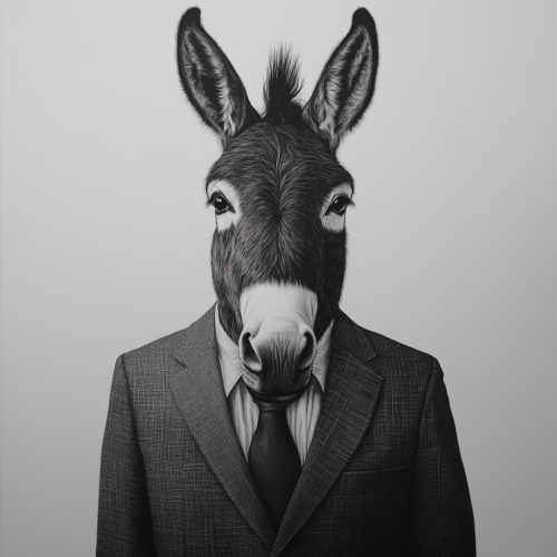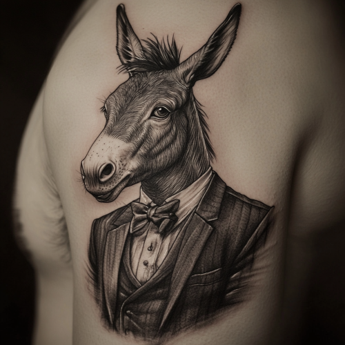 black and grey photo of a donkey wearing a business suit. Angle is from the chest up. Mostly black work with some soft shading. Tattoo style, semi realistic, no background