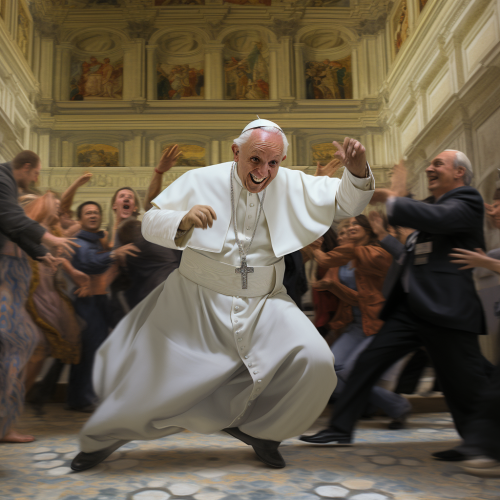 photorealistic the pope doing head spin dances in the vatican, tourists walking around ignoring the pope