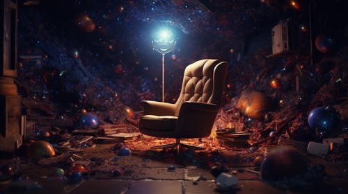 photorealistic cinematic 4K high-resolution scene with cinematic lighting of a big bang in space where hundreds of ordinary daily objects (such as chair, computer, phone, bed, television, mug, book, bed, teddy) suddenly appear into existence from a single central point in the middle of the image --ar 16:9 --s 750 --v 5.1