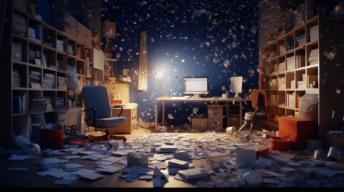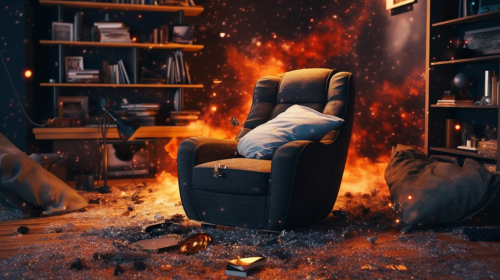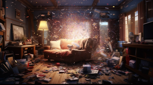 photorealistic cinematic 4K high-resolution scene with cinematic lighting of a big bang where hundreds of ordinary daily objects (such as chair, computer, phone, bed, television, mug, book, bed, teddy) explode into existence from a single central point in the middle of the image --ar 16:9 --s 750 --v 5.1