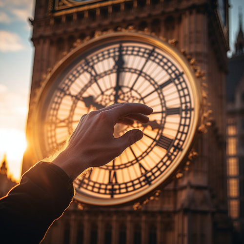 A close-up of the hands of Big Ben's clock at sunset, the golden hour light highlighting the time, shot with a Nikon Z7 for a blend of historical and modern aesthetics --v 5.2