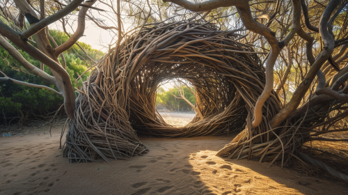 giant thatched nest, torus shaped, archway of thick branches, intertwined branches, enormous example of environmental art, the nest is made of eucalypt tree branches, the image of the nest is, concepts --ar 16:9