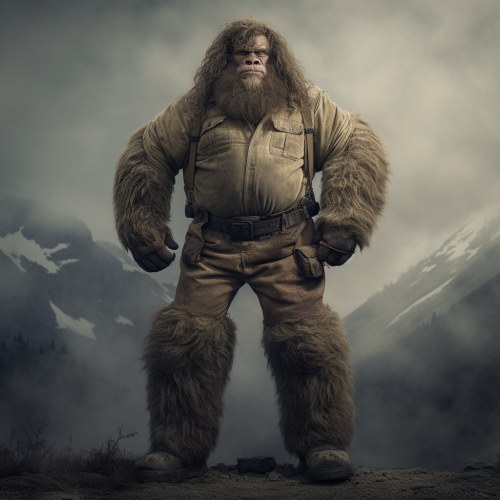 Big Foot standing, looking down on a kid, facing the camera straight on. The creature should be large and imposing. Focus on detailed textures of its brown fur and the surrounding forest environment, ensuring clarity and realism, hyper-realistic