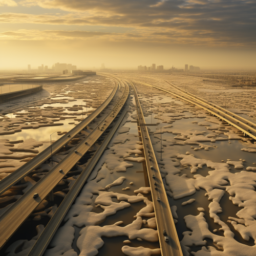 simple 2d comic style illustration. Far away perspective, birds eye side view of Cars on a los angeles freeway spaced out evenly.