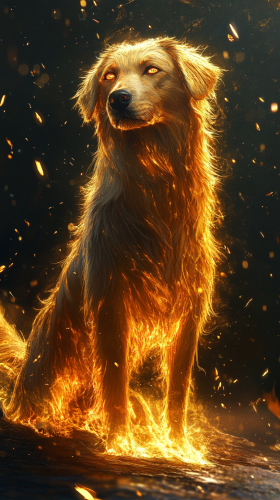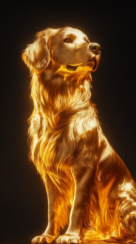 A realistic dog with a majestic golden coat, gleaming as if made of pure gold. The dog stands heroically with an epic and grand presence. Its fur is richly detailed and silky, and the lighting dramatically highlights the golden sheen. Surrounding the dog are subtle, yet striking elemental effects--such as shimmering particles of fire or ethereal, glowing wind--enhancing the sense of grandeur and epic scale. 8k, high quality, --ar 9:16