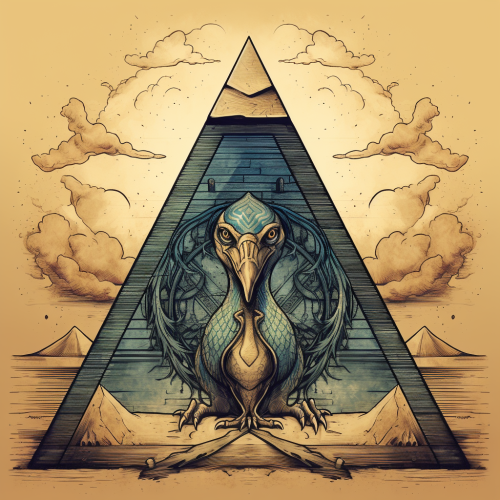 an egyptian pyramid with a humanoid bird reptillian hybrid floating on top next to the star of david above it