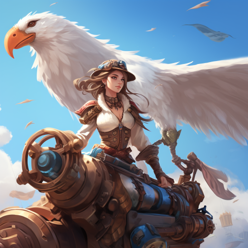 harpy wielding a giant pirate cannon, harpy, half bird hybrid race, beak, feather skin, blue sky background, league of legends artstyle