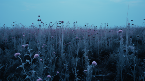 "Gloomy Meadow" - A dark and foreboding meadow landscape with a thick and colorful fog that creates a sense of mystery and intrigue. The sky is a deep shade of blue with hints of pink and orange on the horizon --ar 16:9 --chaos 50