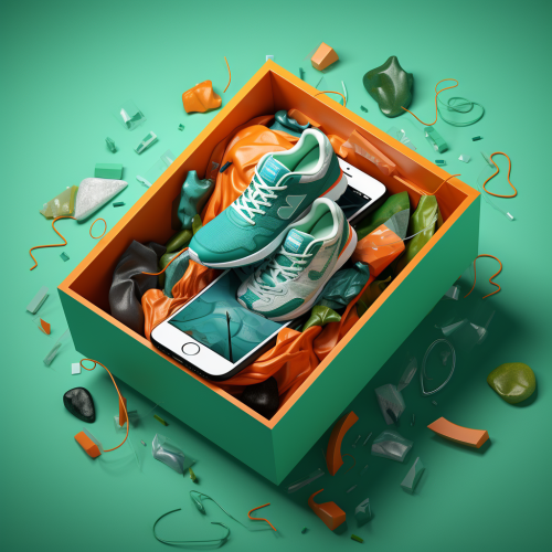 Combination of light green and green gently crumpled background, viewed from a bird's-eye perspective, featuring four shallow cardboard boxes containing focus onwebshop items in various colors, with UI/UX elements, ultra realistic hd