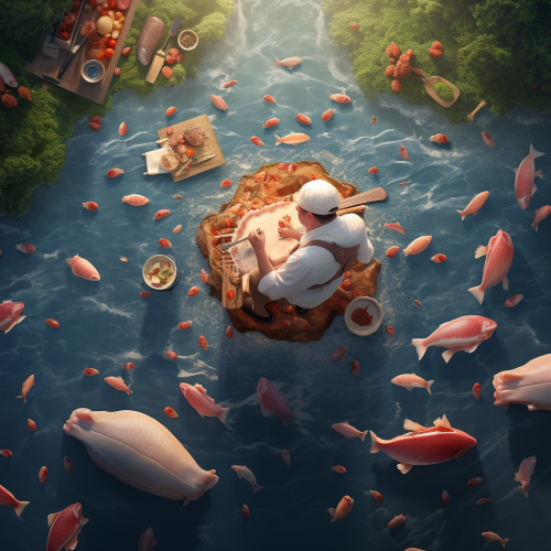 Bird's Eye View, the cover of a food advertisement, shows some pieces of pork forming a river, ultra-realistic pork, a man boating in the river, red and light blue, natural light, advertising design poster, movie poster, macro scene, big atmosphere, rendered in cinema4d, texture-based, realistic details, movie lighting, 8k