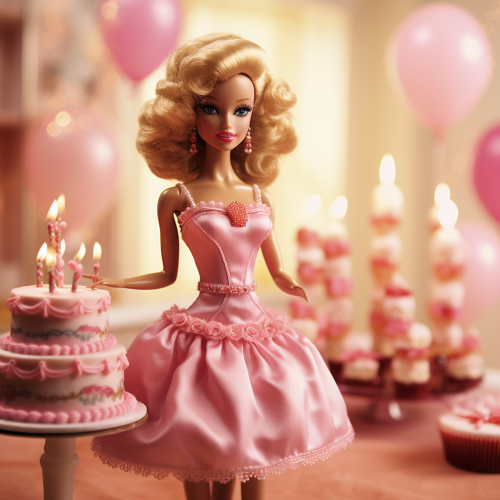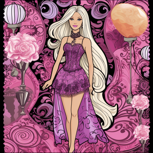 Illustration, 7 year old birthday invitation, blonde barbie wearing addams family clothing, paisley print, 3d animation, vector art, --v 5.2