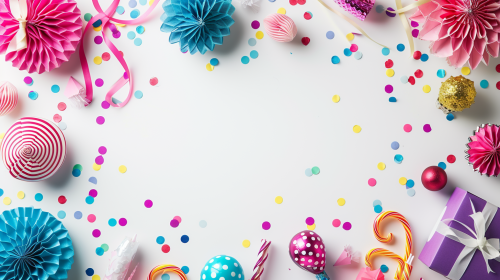 Birthday party festive decorations on white surface middle is empty Top-down view --v 6.0 --ar 16:9