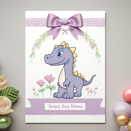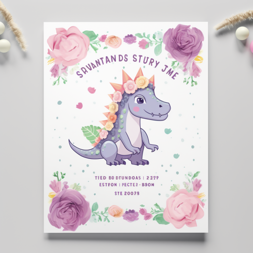 Children’s Birthday Party invitation, female dinosaur wearing a bow and flowers, invitation template, feminine color scheme, cute