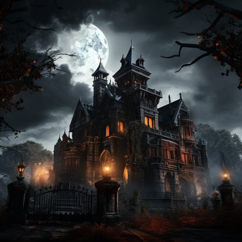 a haunting and atmospheric image of a gothic haunted mansion for a horror story cover. The setting is twilight with an eerie ambiance. The mansion is in a state of decay with claw-like turrets, and windows resembling dark, empty eye sockets, under a tumultuous sky with a sliver of the moon breaking through clouds. In the foreground, a rusted wrought-iron gate is ajar. A sinister cloaked figure stands by the gate, face hidden in shadow except for the chilling glint in his eyes, hand outstretched as if inviting the viewer in. The ground is shrouded in mist. Use a muted color palette dominated by greys and blacks with hints of muted green and subtle touches of red to suggest an unseen menace. Shadows cast by the moonlight should appear almost alive, enhancing the unsettling feeling