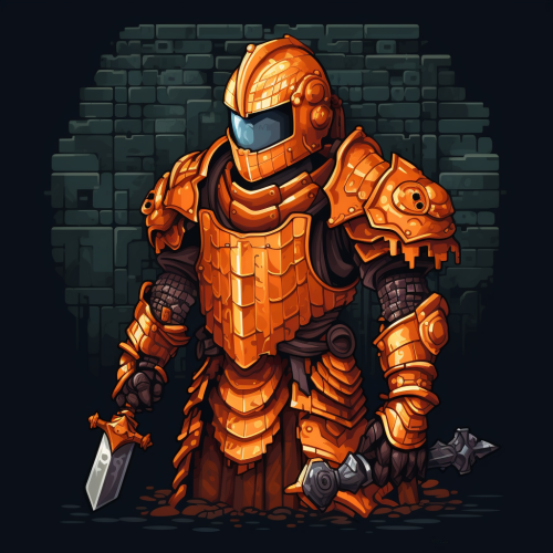 pixel art of a bitcoin knight, orange armor with the bitcoin logo in the chest. graphics art