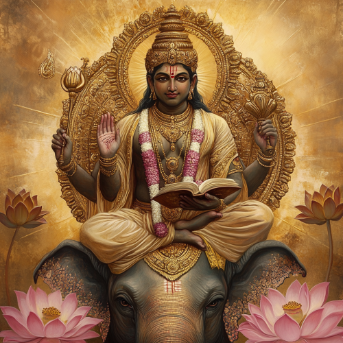 Hindu god brihaspari, sitting and god have 4 hands , in two hands he holds lotus and third right hand is Bless position and fourth Left hand he holds a open book, backdrop is Golden with lotus atmosphere, devotional and realistic images** hyper realistic cinematic look** create for YouTube video