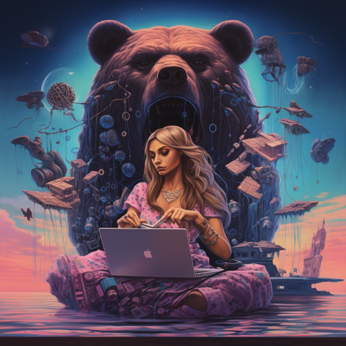 illustration of female bear, style of salvador dali, trippy, surrealism, melting clocks everywhere, sitting at laptop computer, bitcoin floating in the background::