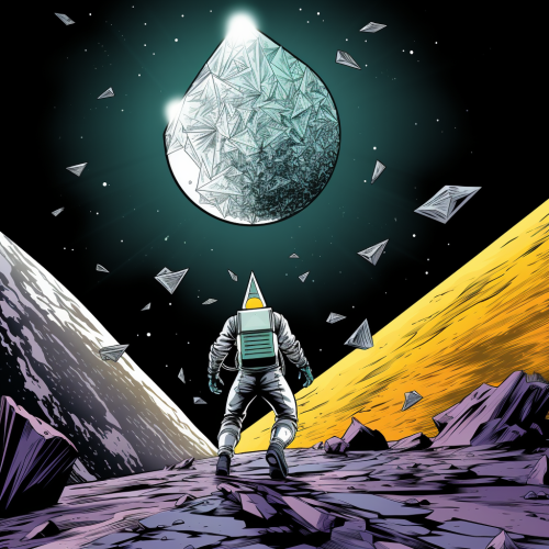 Bitcoin 3D model is on the moon, is alternating between modern cubes, bitcoin 3D model is depicted sharp circle, moon and other cubes depicted in full color. Ancient Art style