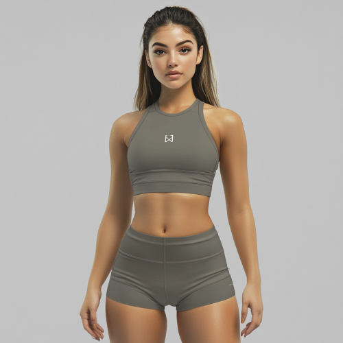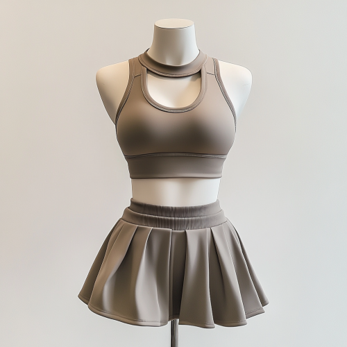 Create a realistic image of a female model wearing a modern, two-piece activewear set. The set includes a fitted, sleeveless high-neck cropped tank top and a high-waisted athletic skirt. Both pieces should be in a muted taupe color with light grey undertones and a matte, smooth finish. The top should have a minimal white logo centered at the chest. The model should have an athletic build and be posed naturally, showcasing the sporty yet stylish outfit. The setting should be a clean, neutral backdrop that complements the minimalistic and sophisticated nature of the outfit.