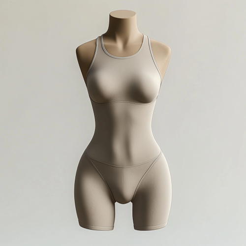 Create a high-resolution image of a modern, fitted, sleeveless one-piece bodysuit with a tank top-style top and mid-thigh length shorts. The bodysuit should feature a racerback design and a rounded neckline for flexibility and support. The material should look seamless and slightly matte with a subtle sheen, made of a spandex-nylon blend for a four-way stretch effect. The color should be a warm, neutral taupe with grayish-brown undertones, ensuring an elegant and minimalist style. Display the bodysuit on a mannequin with a plain white or neutral background to highlight its design details