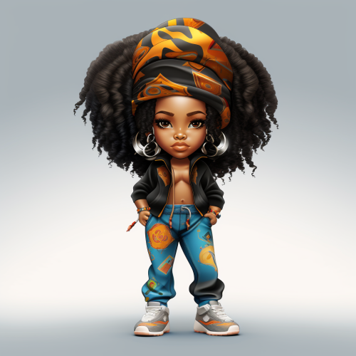 create a composition mock up of extreme caricature chibi Afro black hip hop girl wearing Ankara print, white background