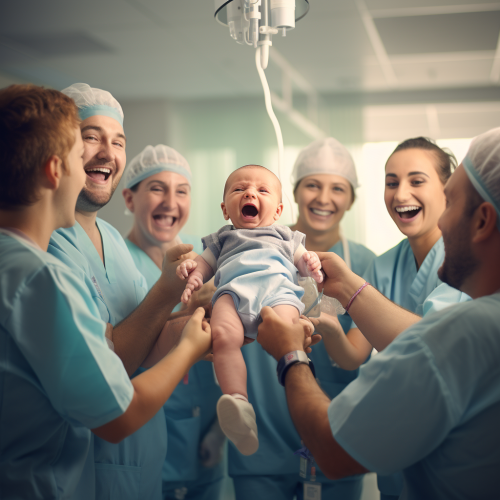 doctors and nurses surrounding baby and holding him up in the air. baby happy, hospital setting, photo realistic, all hands near baby close up