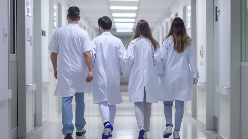 happy doctors, in hospital corridor, wearing scrubs, hospital, cheerful, happy, realistic, --ar 3:2