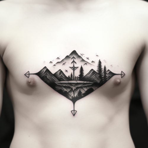 simple crest tattoo for lower rib cage area, black and white with axe, arrow flying, trees, mountains and fire