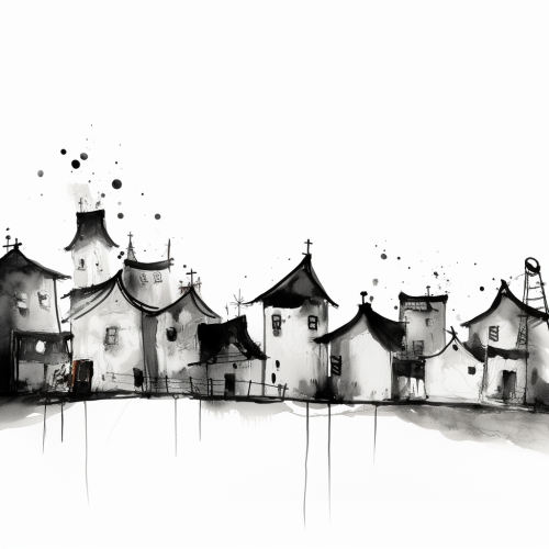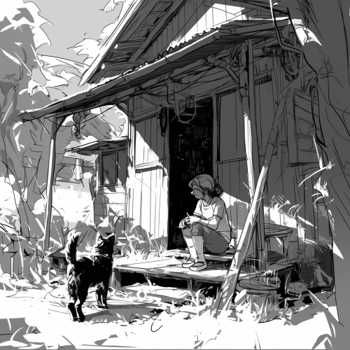 black and white sketch style, shot of Aunty Aileen about 40 years old, shoulder level, wide shot, can see the surrounding tidy environment, walking from the animal shelter, and the animal shlter name is My Pets Haven --niji 6