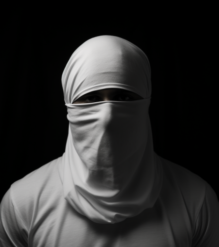 a front view portrait of person on black background with head and face covered with white fabric, in the style of black and white, backlit photography, hyperrealism, minimalist photography,male, porcelain --ar 54:61