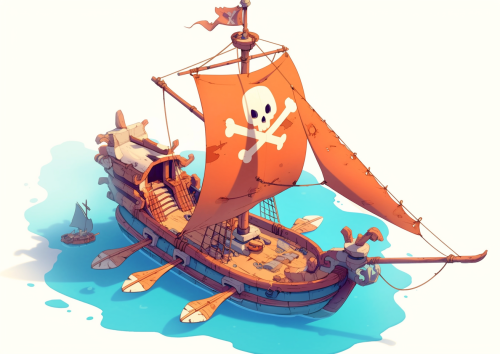Isometric View of a Whimsical, Simplified Cartoon Art Image of a Small-to-Mid Sized Pirate Ship, 15th Century, Animation Model Sheet, --ar 7:5 --niji 6