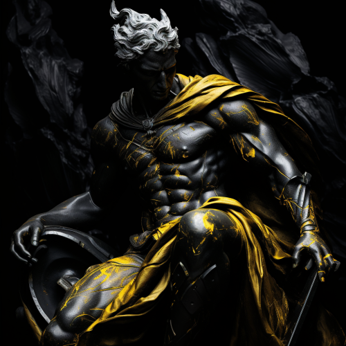 black background, dramatic old statue of man with big beard looking up muscular black and white, yellow paint brush stroke, hyperrealistic --ar 5:7