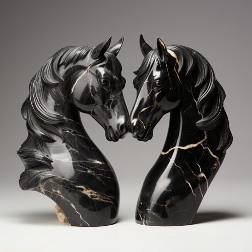 "A minimalistic poster featuring two horses, one black and one white, without visible facial features. The horses are facing each other, depicted with simple, clean lines. The background is a rich burgundy or dusty pink, creating a soft contrast with the horses. The design focuses on simplicity and elegance, highlighting the natural forms of the horses without any unnecessary details."