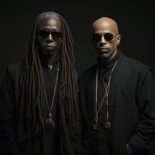 one man black with dreads and one man white bald, they are dressed in black cloth glasses