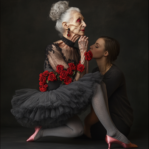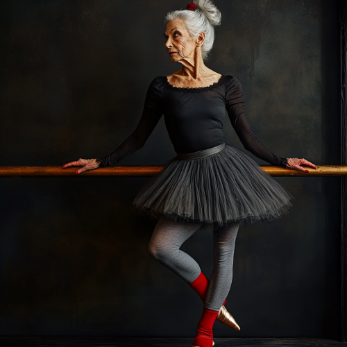 A 70-year-old ballerina in a short and puffy black skirt and gray tights, wearing red ballet shoes. Her gray hair is styled in a bun, her face shows many wrinkles, and she has bold red lips. She is standing by a ballet barre against a dark background