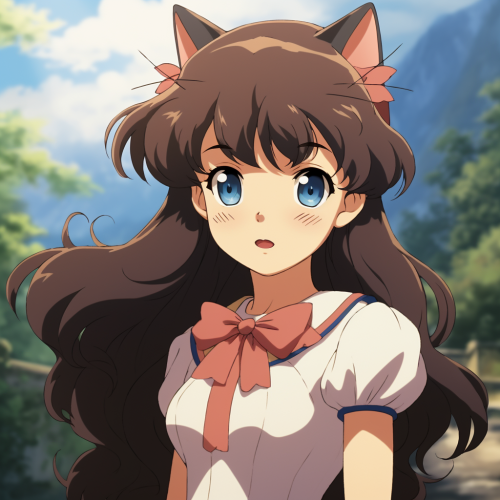 catgirl Pokémon trainer, pink bow and dress, puff sleeves, very long curly dark brown hair, blue eyes, designed by Hayao Miyazaki, DVD screen grab from Studio Ghibli