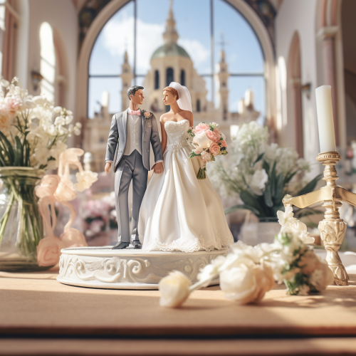 comic watercolours, Wedding ceremony in the church, view over the priest's shoulder, a festively dressed wedding couple, both holding a smartphone, --v 5.2 --ar 3:2