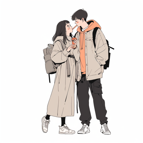 A Happy couple illustration, minimalism, white bg. full body, with tinny pocky in hand, Korean illustration, have shoes --niji 5