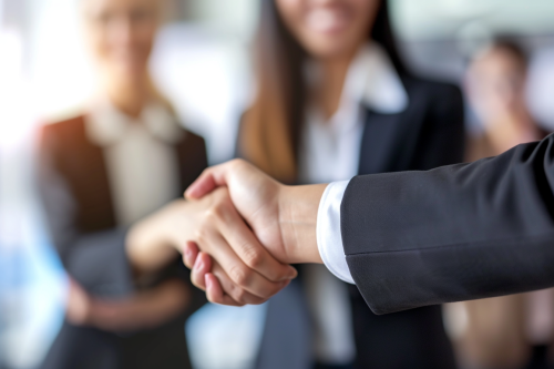 Businesswoman handshake and business people. Successful business concept, selective focus, copy space --ar 3:2 --v 6.0 --s 50