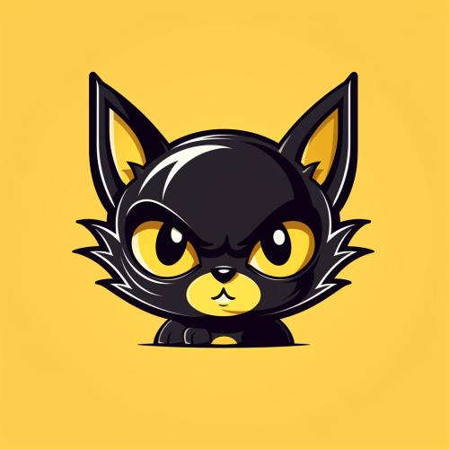 cartoon logo, head of black cat, minimal shapes, with big yellow eyes, without mouth, cool and funny style, cartoon, astro boy anime style, old shcool, yellow background
