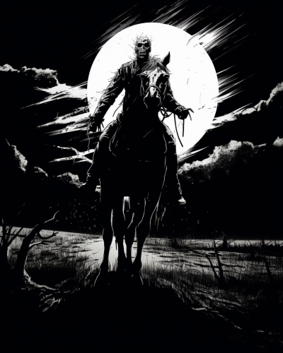 black and white circular lineart woodcut sleepy hollow headless horseman