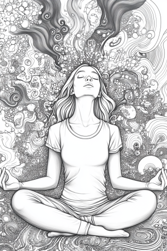 an bold and easy coloring page, black and white, thick lines, mostly white space, minimal black space, of a woman laying in a hammock with trippy designs behind her