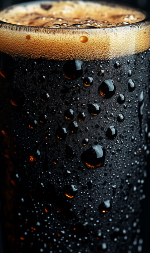 Close-up of black beer foam with water droplets on a glass, the foam is very thick, high resolution, highly detailed, stock photo, two-thirds body view. --s 900 --v 6.1 --ar 3:5