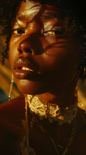 Detailed photo of a beautiful black woman, maison margiela model, fashion campaign, eerie, sun lighting, half body, Fujifilm camera, 8k, Post-Production, VFX --ar 9:16 --v 6.0
