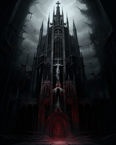 Photorealistic black cathedral, cross on tower, horror architecture, dark white and light red --ar 4:5
