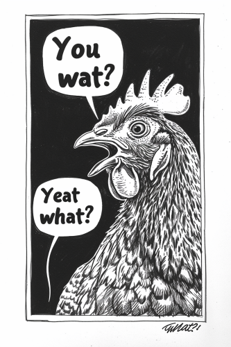 chicken asking "You eat what?", high detail black and white ink, comic strip with dramatic --v 6.0 --ar 2:3