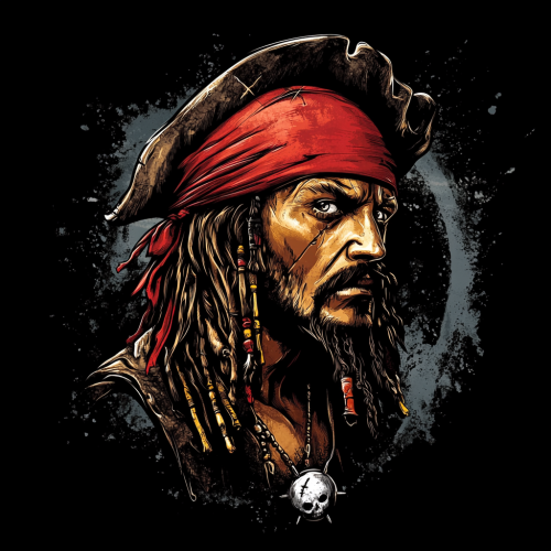hand-drawn logo of an old pirate with dreadlocks, wearing a red bandana. The face is in profile, and the pirate has silver chains around the neck, with a small metal coin attached. The background is black. The character wears white boots. The style is watercolor. The pirate also wears a red hat. The image is Pirate logo, pirate head with dreadlocks and a red cap, wearing a silver cross necklace, dark background, watercolor style in the style of Anna Dittmann, sticker design, vector art, white on black background, one character only, detailed face, wearing diamond teeth grillz. 3 Pirate, head with pirate hat and cross patch on the chest, red bandana over the eyes, dreadlocks under the cap, silver necklace around the neck, watercolor, solid black background, sticker design, vector art style, hyper-realistic illustration, ultra-high resolution, high detail A logo of a pirate with dreadlocks and a red cap, a white cross on the hat, a bandana around his neck, a silver medallion hanging from its side, on a black background, in a cartoon style, with a watercolor effect. Hellstar grsphic