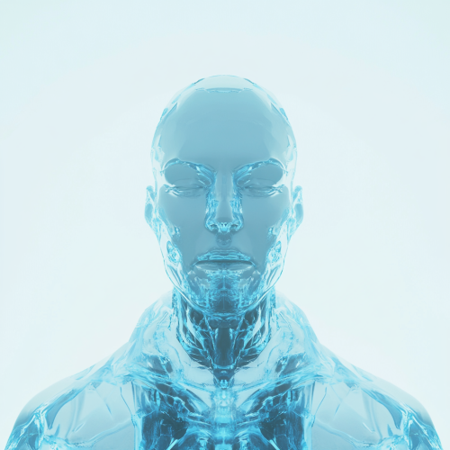 A sleek, dark black background with a glowing blue gradient light from the center, illuminating a male figure with strong, healthy hair. The man is looking confident and vibrant, with light reflecting off his hair to symbolize growth and vitality. A bright, shiny light in the middle adds a futuristic feel, with a subtle yellow accent in the corner matching the sleek design